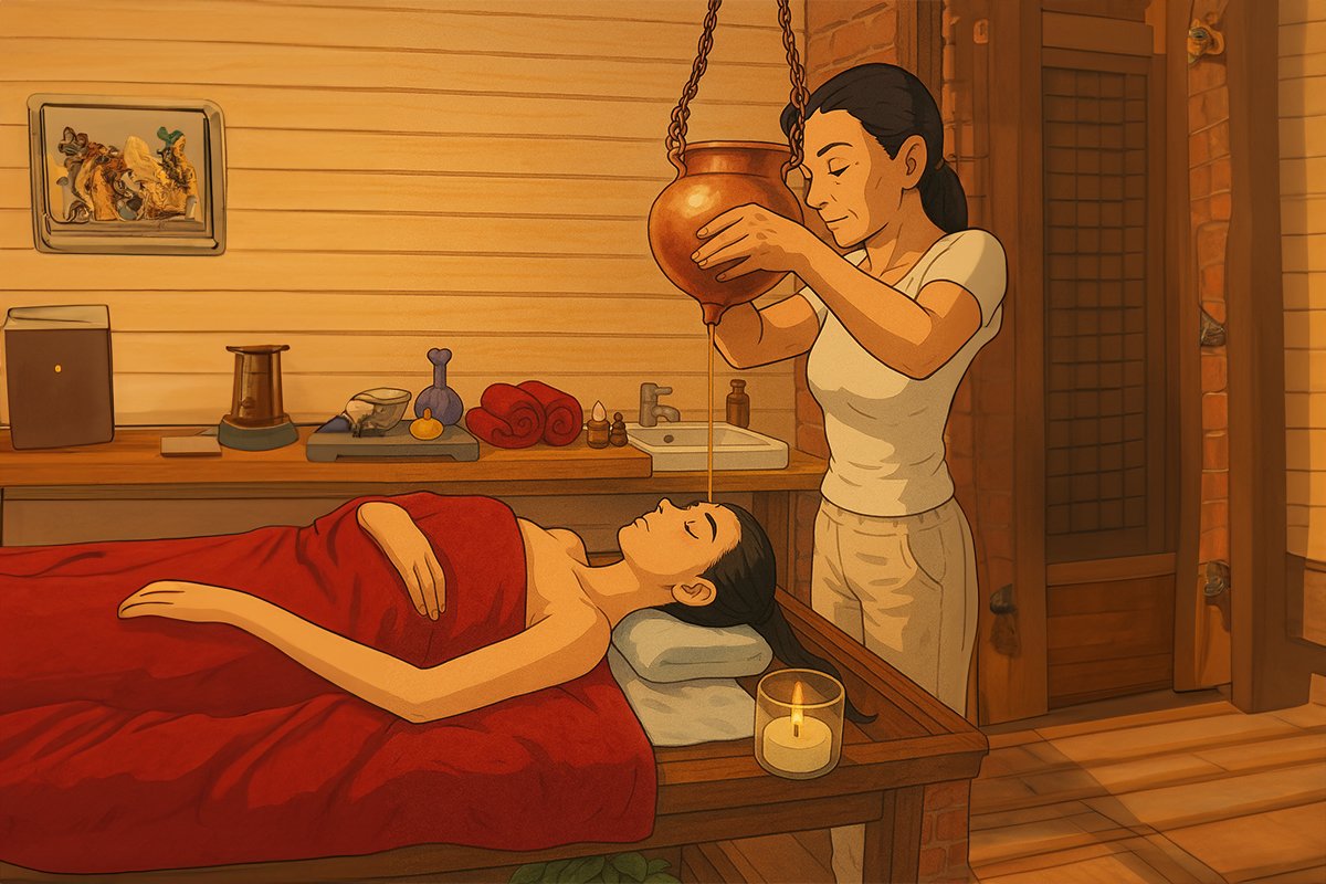 Netra Dhara is an Ayurvedic ocular therapy where a continuous stream of herbal liquid is gently poured over the eyes. This specialized cleansing technique is designed to soothe, hydrate, and rrefresh the eyes. It is especially beneficial for those experiencing irritation, dryness, or vision strain due to excessive screen time or environmental stress.